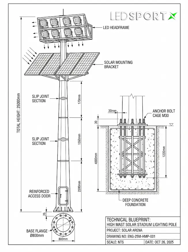Don’t let installation guesswork compromise safety. For every high mast order, LEDSportX provides a comprehensive AutoCAD engineering drawing tailored to your project’s specific wind load and soil conditions.